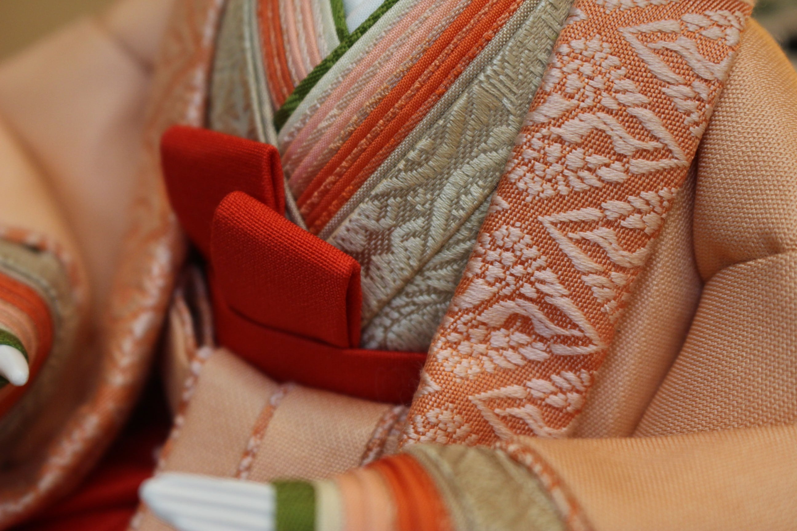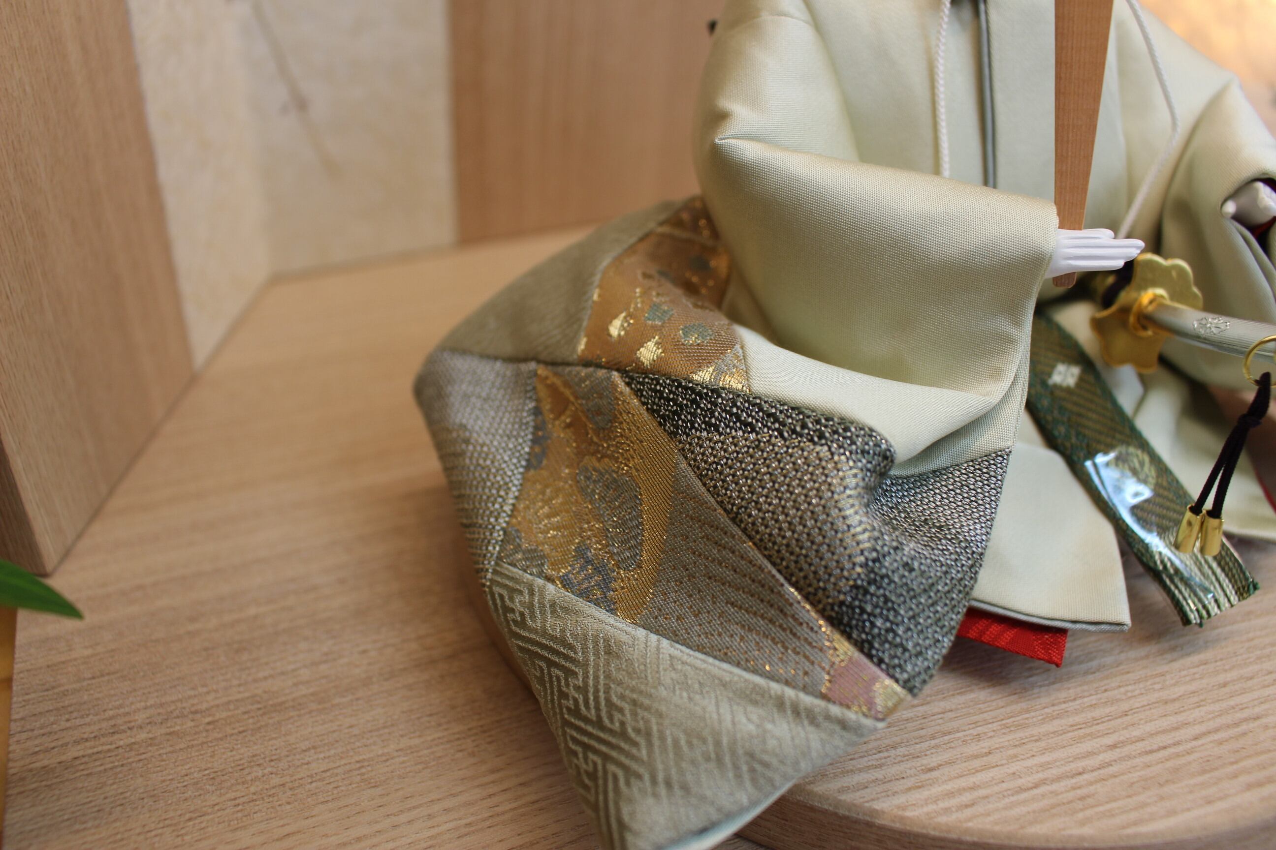 この切嵌の人形の特徴は衣装にみられる唐織や金襴、正絹の異なる種類の布を剥ぎ合わせ、