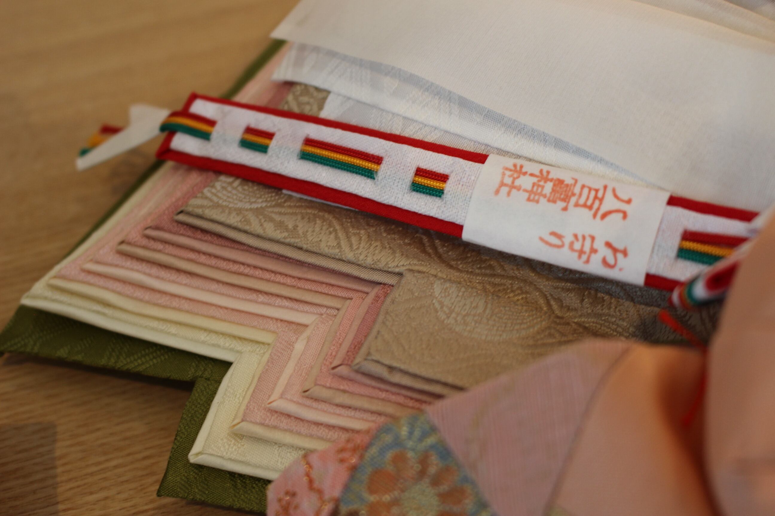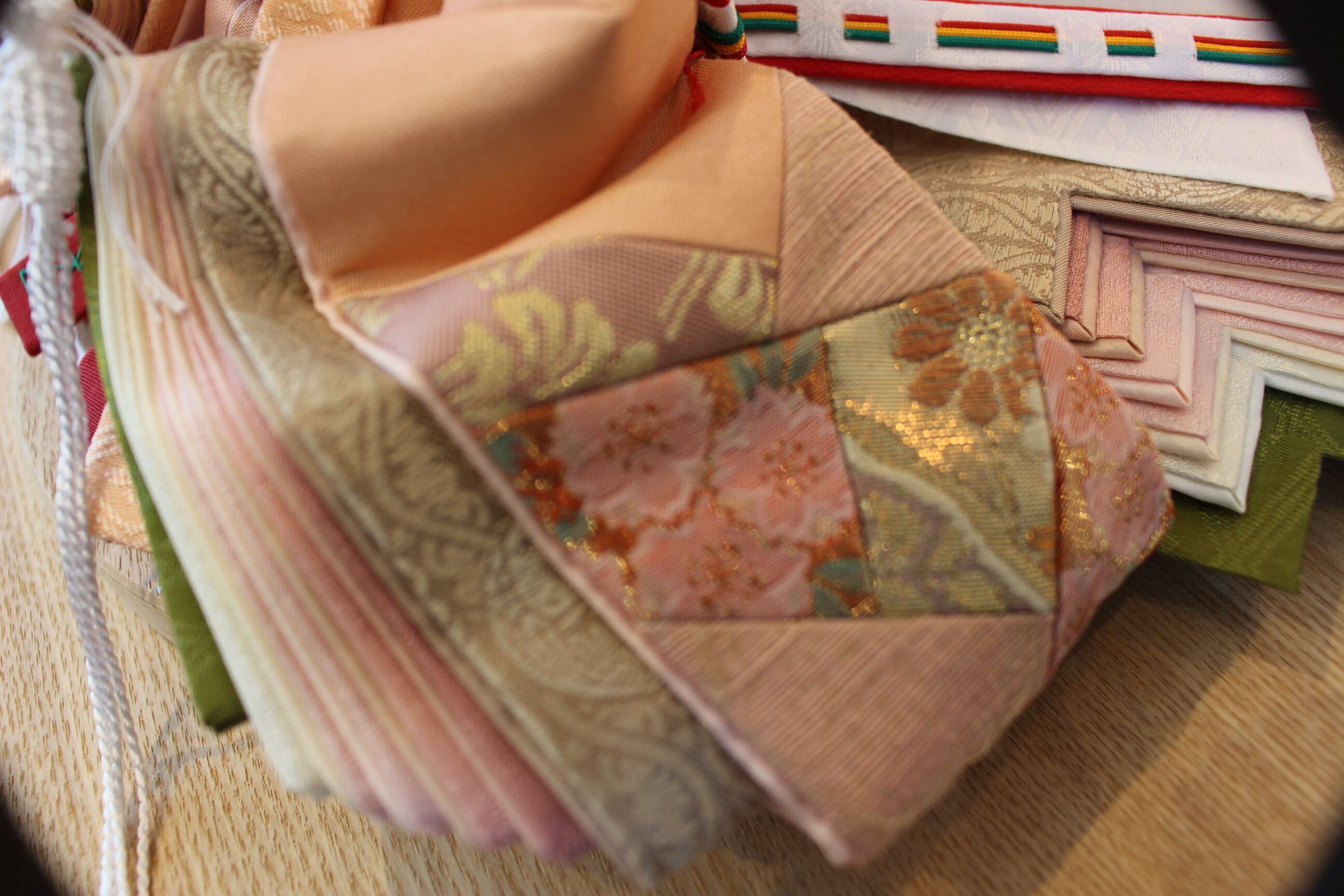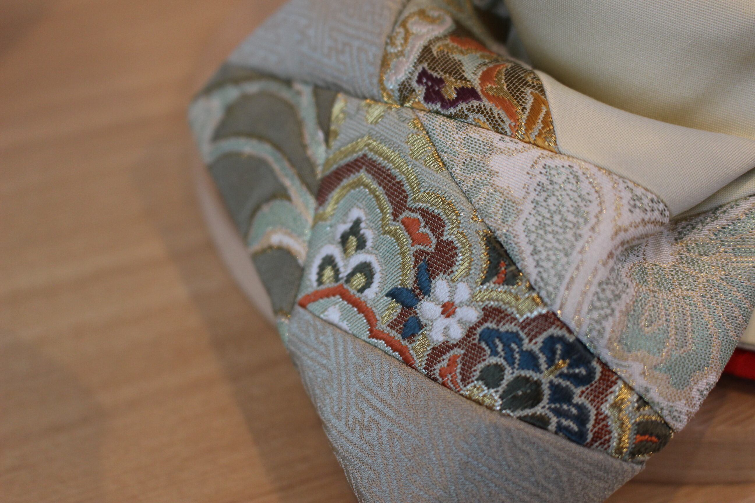 こちらの御衣装は数種類の帯地をパッチワークのように、継ぎ合わせる技法で
