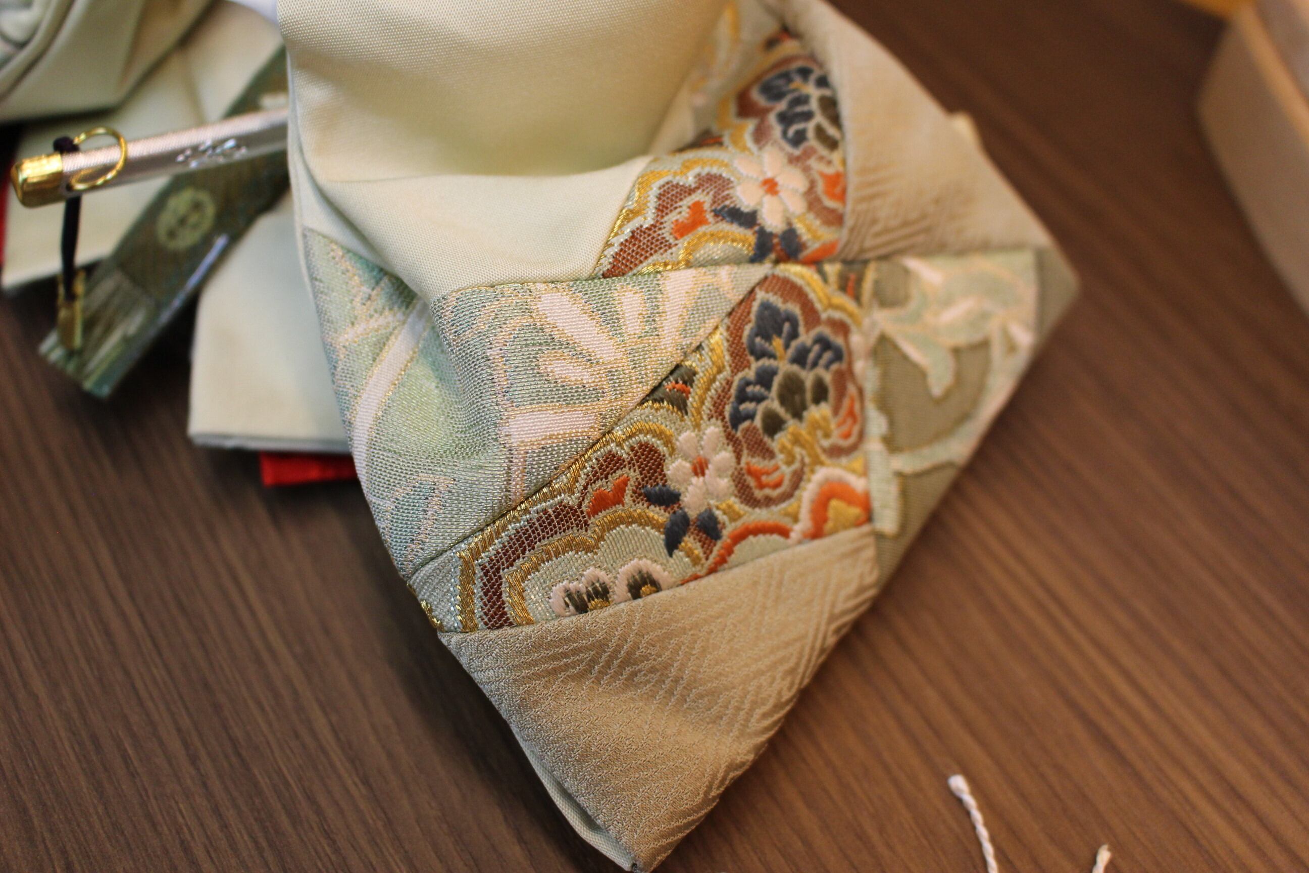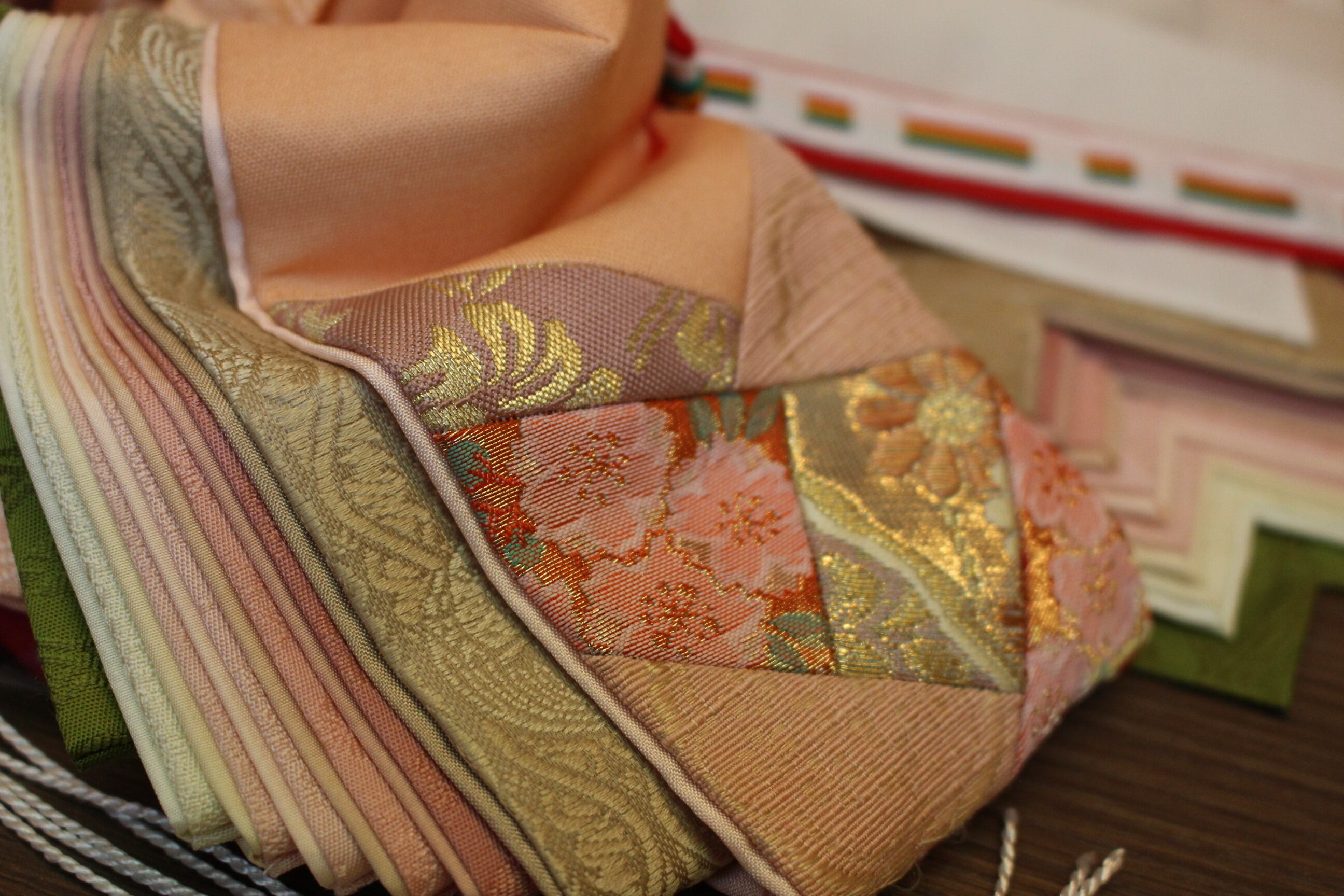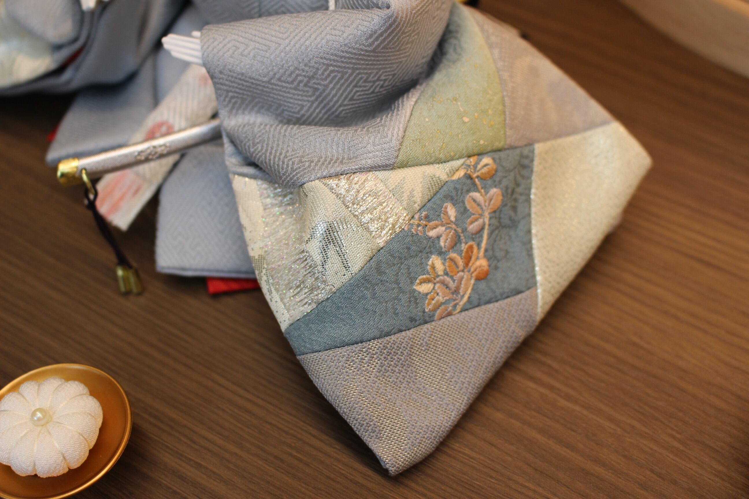 こちらの御衣装は数種類の帯地をパッチワークのように、継ぎ合わせる技法で、