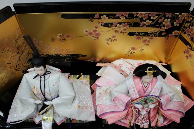 収納式御飾台には駿河本金箔絵で桜と枝が台とお屏風に桜満開に描かれ高級感たっぷりなセット。お人形のサイズも大きくボリューム感もあり人気の収納飾りです。
