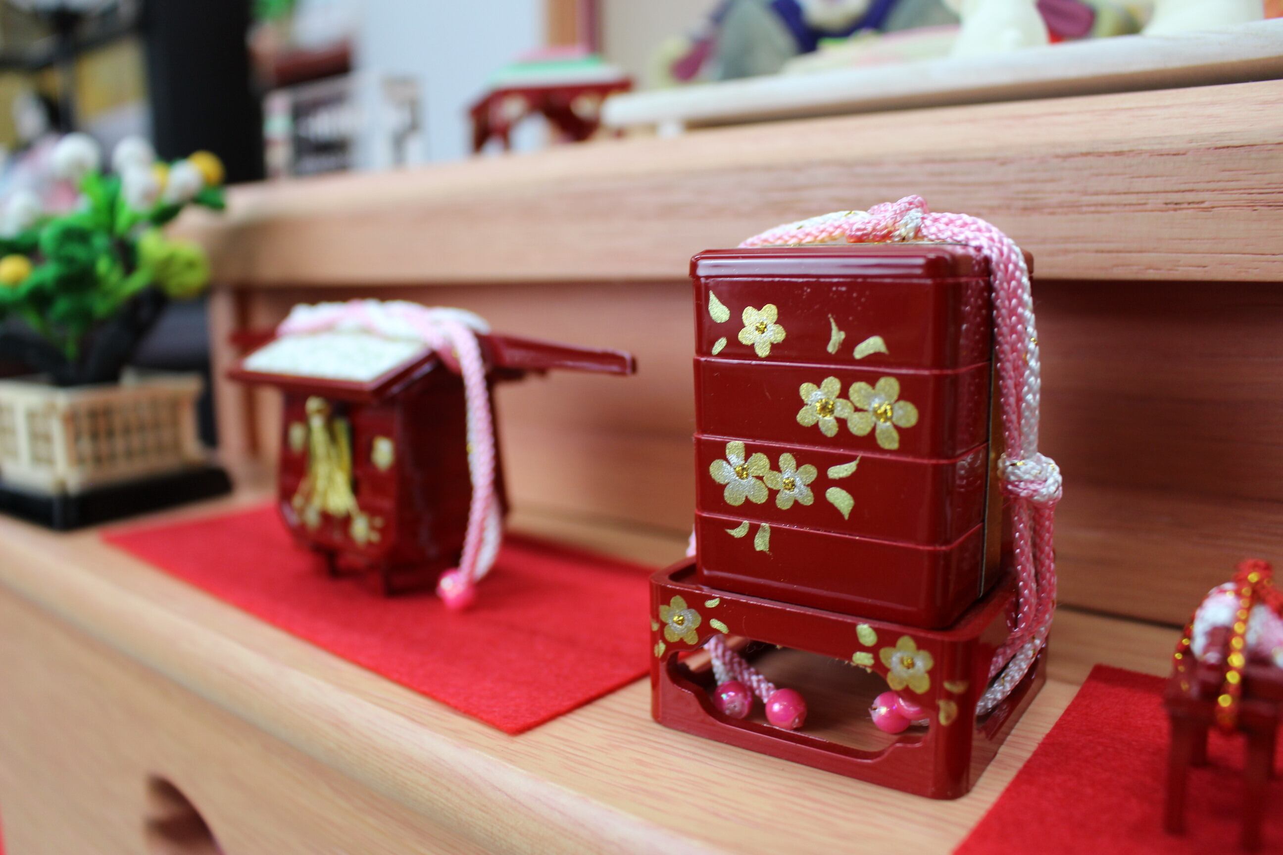 ピンク収納は人気の色目、お飾りしているお雛様・お道具・御屏風など