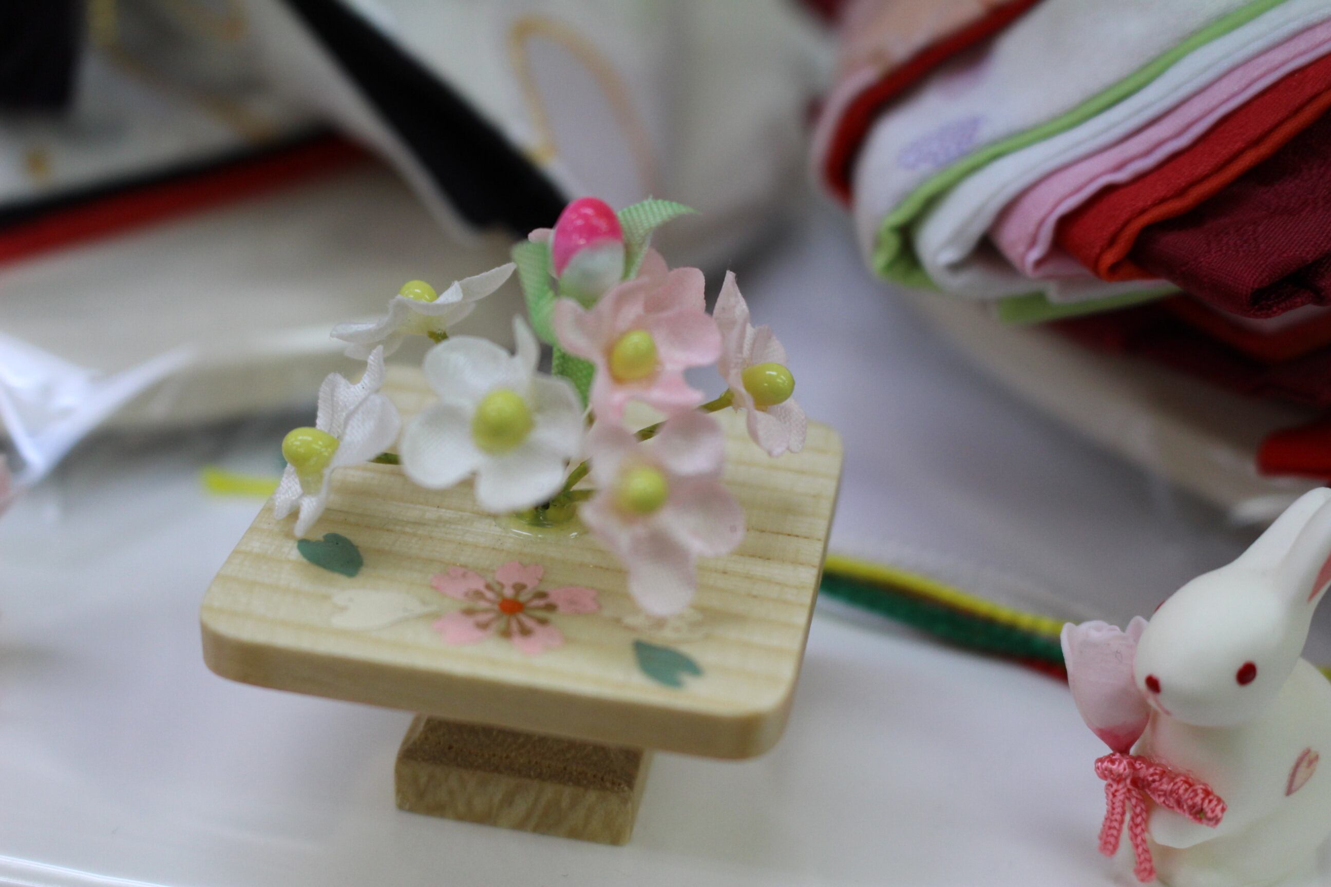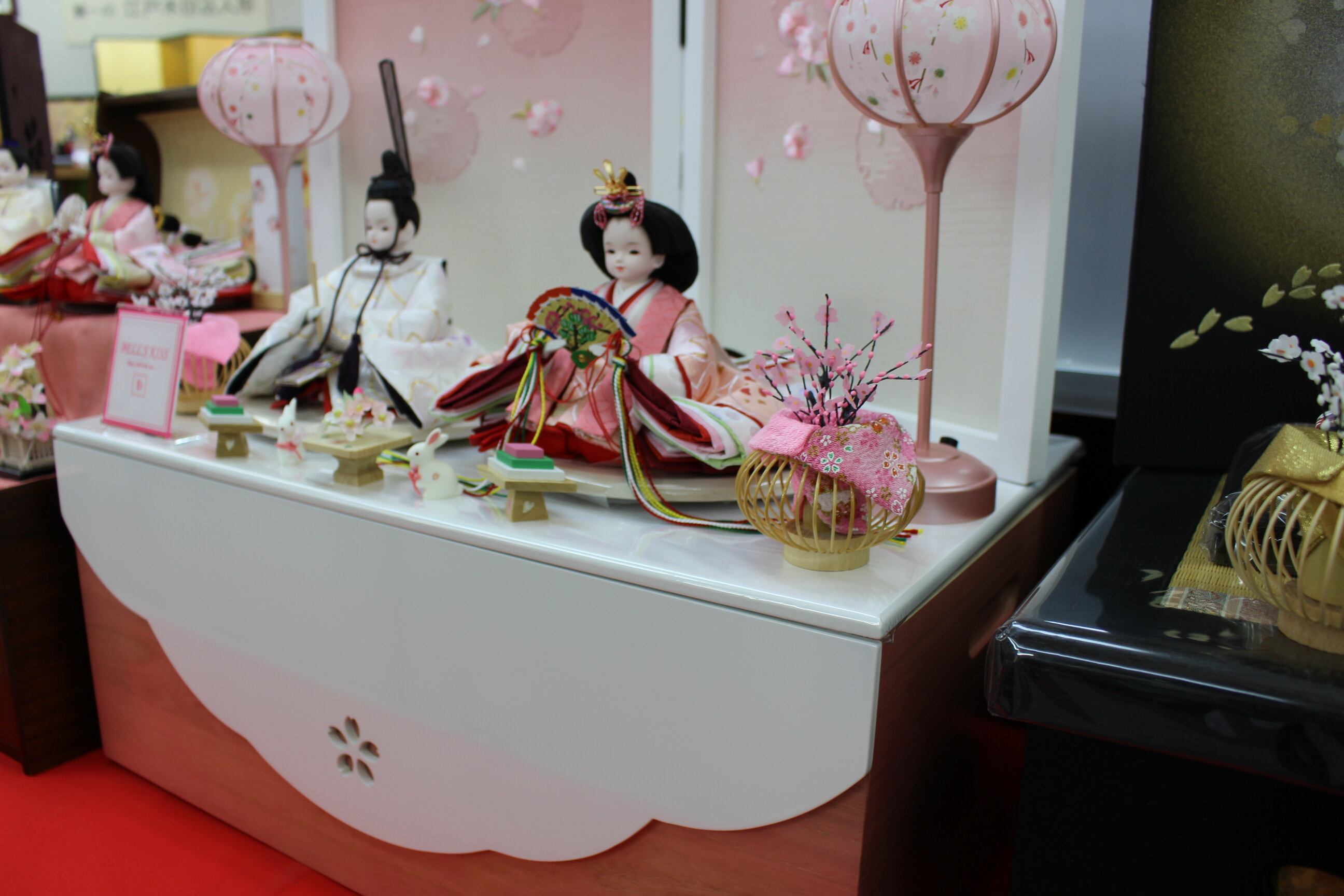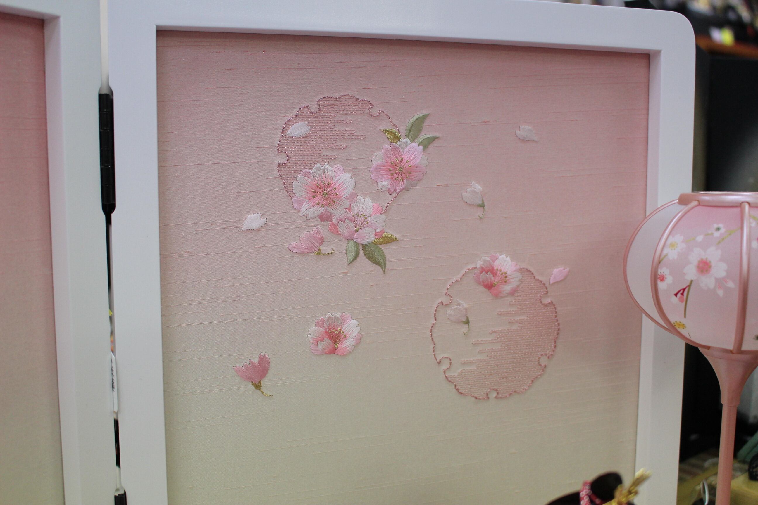 静岡製品のホワイト・ピンク収納飾り台に二曲桜刺繍屏風です。