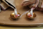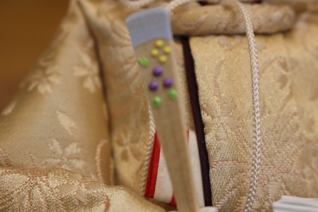 新作のお道具は塗りの扇としゃくがとても可愛く人形を引き立てています。